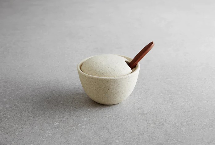 A small bowl with spoon that can be used for salt and spices.